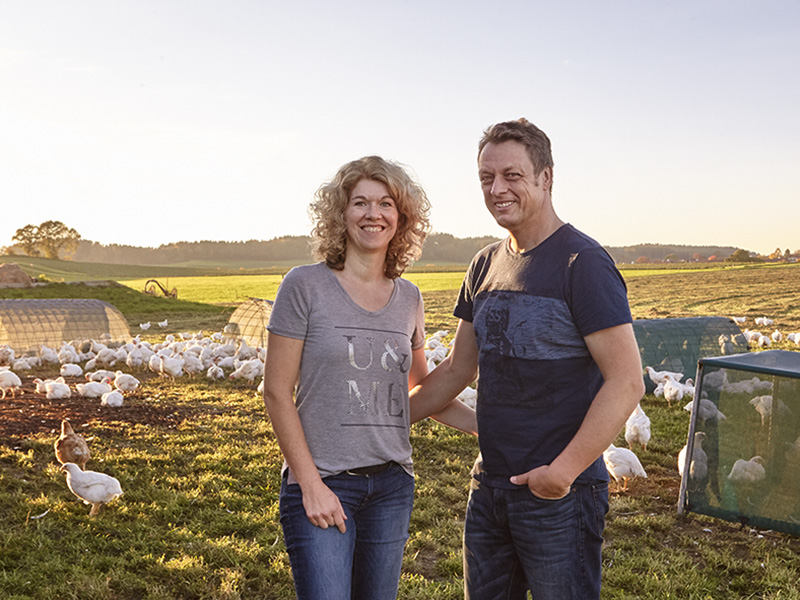Unser Hof liegt in einem kleinen Weiler der Gemeinde Eberhardzell im Landkreis Biberach. Genau gesagt haben wir bei uns in Teuses nur einen Nachbarn, ansonsten sind wir auf weiter Flur allein, umgeben von Grün und Feldern. Hier betreiben wir, Michaela und Michael Buck, seit 2010 ökologische Hähnchen-Mast und Mutterkuh-Haltung. Vorher haben wir Milch produziert. Den Hof habe ich, Michaela, Anfang der 1990er-Jahre von meinen Eltern übernommen. Schon damals war er, wie so viele Höfe der Gegend, als klassischer Milchviehbetrieb aufgestellt: nicht sehr groß, aber er konnte die Familie meiner Eltern ernähren.