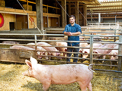 Wenn die Ferkel abgesetzt, also von den Muttersauen entwöhnt sind, „entfallen die sonst üblichen Stressfaktoren, da nur die Sauen aus dem Stall genommen werden“, sagt der junge Landwirtschaftsmeister und betont: „Die Ferkel bleiben in ihrer gewohnten Umgebung und raufen nicht, weil sie sich kennen. Erst wenn sie rund 30 Kilogramm schwer sind, kommen die Jungtiere in den Maststall.“ In fünf Buchten mit offenem Auslauf sind hier je rund 40 Mastschweine beieinander. Und außerdem die Gruppe der rund 20 Sauen samt Eber: „Hier wird das natürliche Bedürfnis der Schweine sich fortzupflanzen mit dem Natursprung befriedigt – ohne Druck, Zwang und Stress“, erklärt der Züchter.